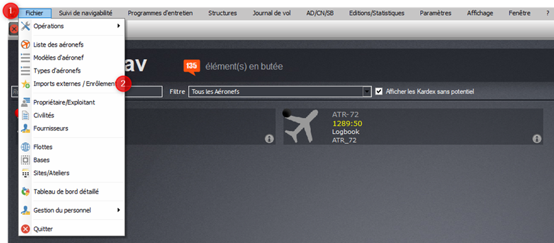 Pour ajouter un aéronef allez sur “Fichier” (1) puis ”Types d’aéronefs” (2).