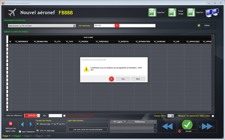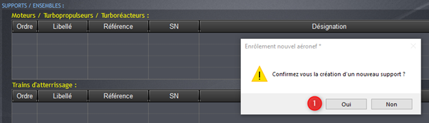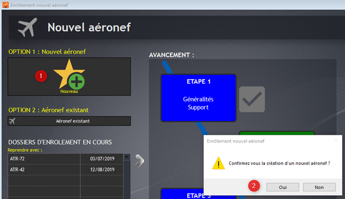 Après avoir cliqué sur Nouveau (1), confirmez la création du nouvel aéronef (2).