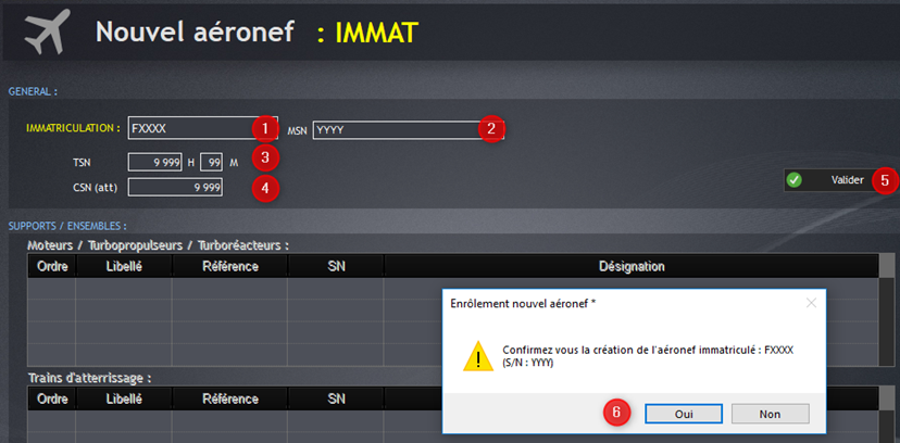 Renseignez l’immatriculation (1), le MSN (2), le TSN (3) et le CSN (4) de l’aéronef puis validez (5) et confirmez la création (6).