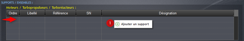 Pour ajouter des informations sur le moteur, faites un clic droit sur une ligne vierge puis sur “Ajouter un support” (1).