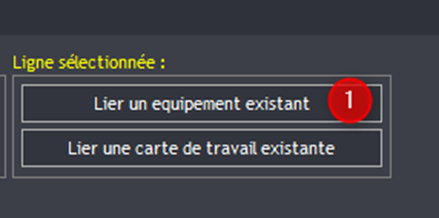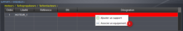 Associez ensuite le moteur à la référence d’équipement requise. Pour renseigner les champs demandés faites un clic droit puis “Associer un équipement” (1)