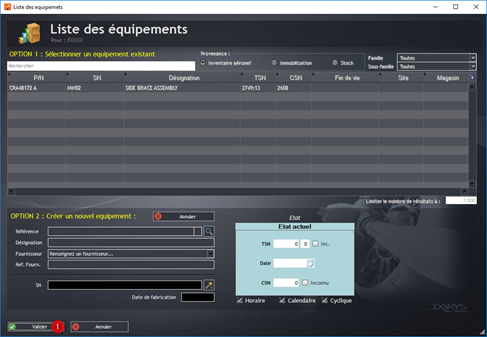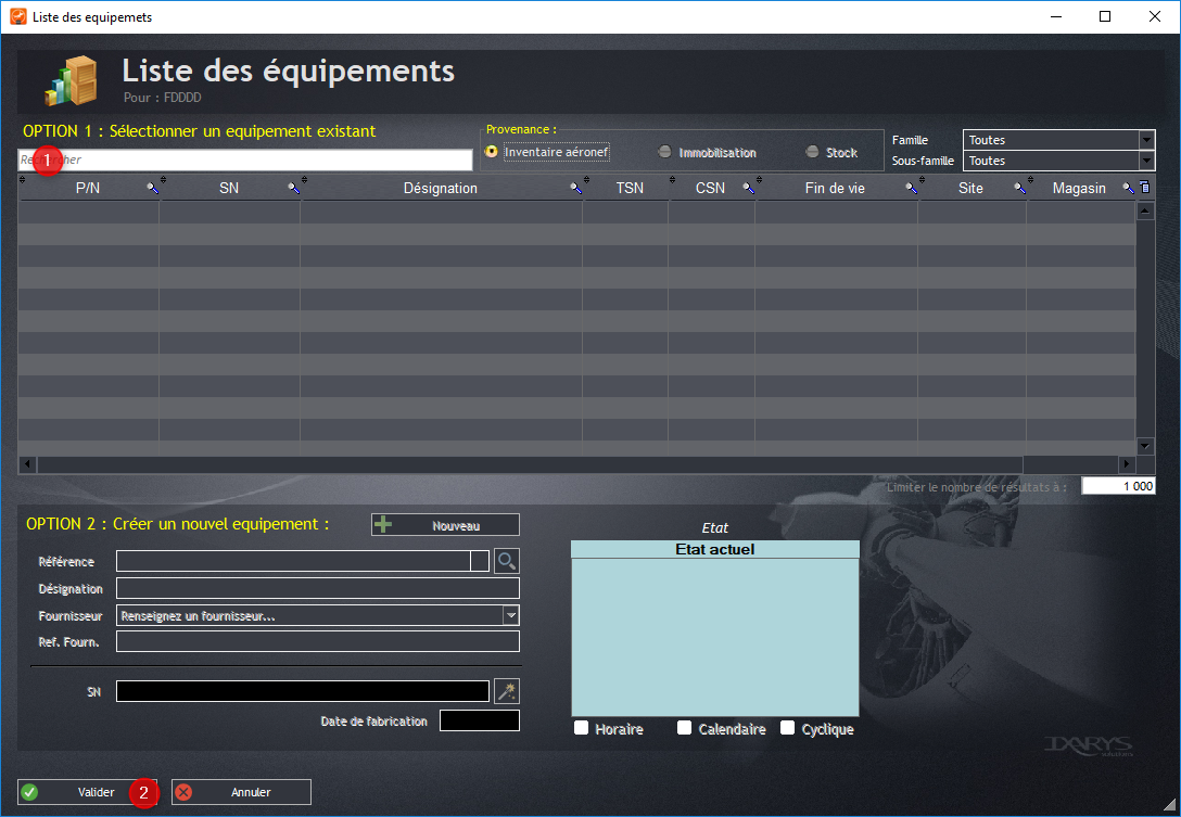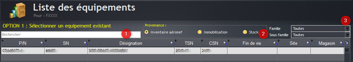 Option 1 : la référence existe ; sélectionnez la référence d’équipement en saisie manuelle si elle est connue (1), sinon par recherche avancée en ciblant la provenance (2) ou la famille/sous-famille (3).