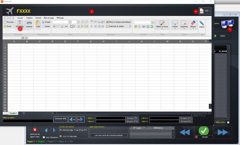 Importer un document peut également se faire après l’avoir créé directement depuis Tracing Nav en cliquant sur (1) afin d’accéder à un tableur spécifique (2). Une fois enregistré (3), il est exportable sous format PDF (4).