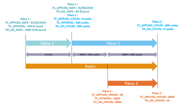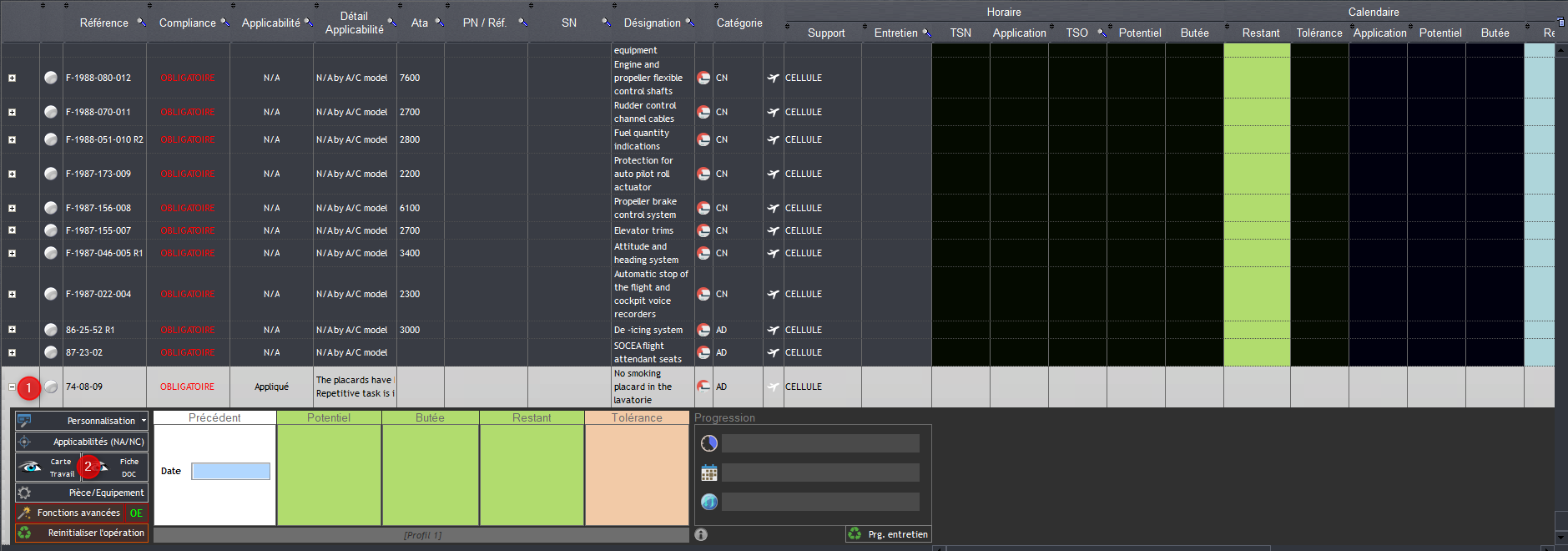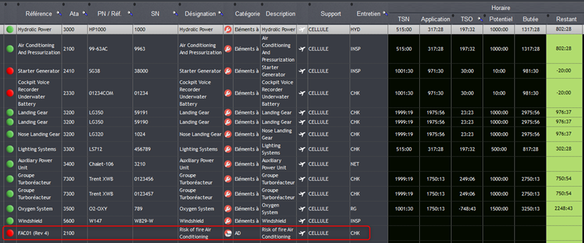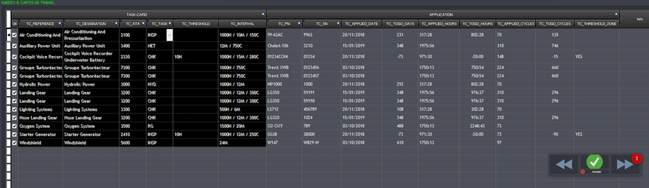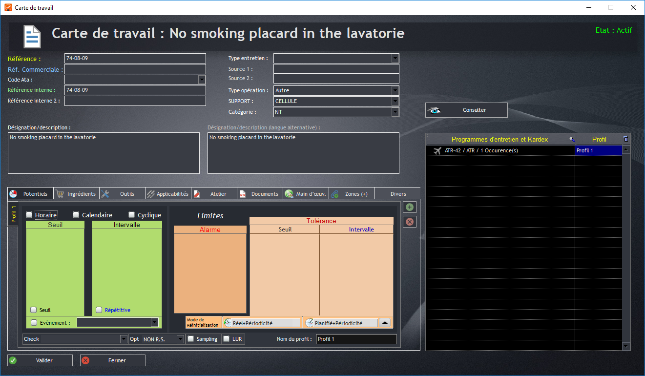 Le programme d'entretien permet de regrouper plusieurs cartes de travail. Les cartes de travail permettent quant à elles d’indiquer le type d’opération à effectuer : Lubrification, Révision Générale, Check, … Elles permettent aussi d’indiquer l’intervalle entre chaque entretien qui peut être calendaire, horaire ou cyclique. Les cartes de travail indiquent aussi le nombre de cycles, de jours ou d’heures restants avant le prochain entretien.