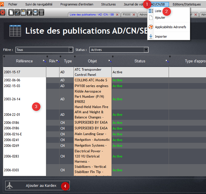 Ajout d’un CN/AD/SB dans le Kardex des éléments actifs 34