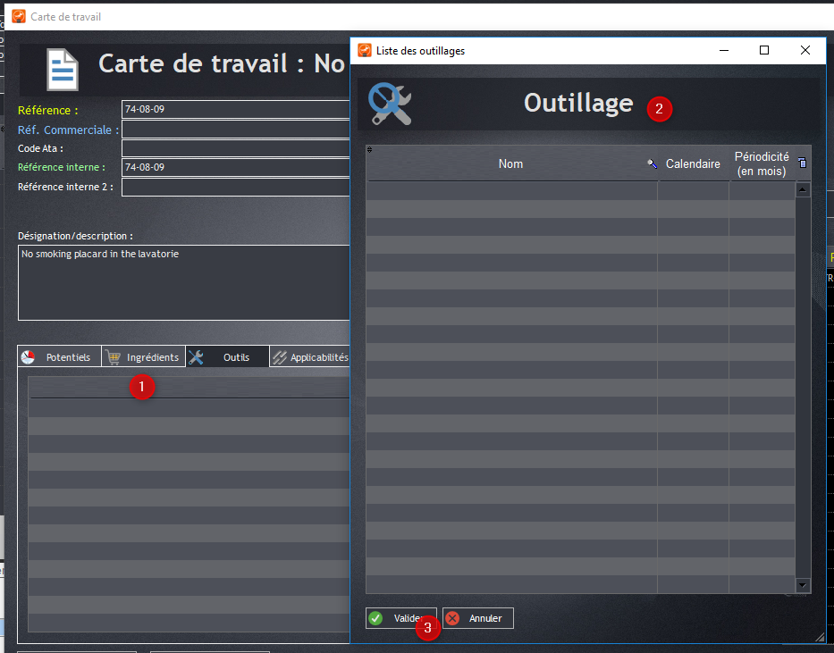 Sélectionner le programme d’entretien prédéfini (1) afin d’accéder au KARDEX et cartes de travail validées (2). Apportez les modifications selon exigences nouvelles et validez (3).