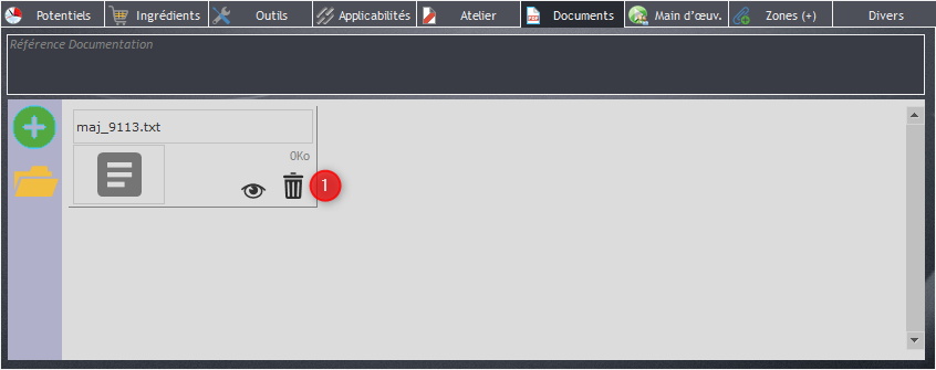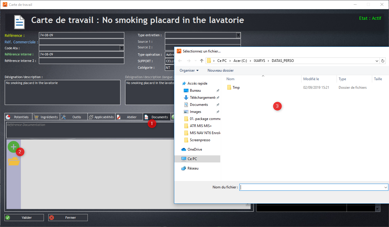 Il est possible d’ajouter un document complémentaire à la carte de travail. Pour cela allez dans la rubrique “Document” (1), clickez (2), puis choisissez le fichier dans le dossier concerné.