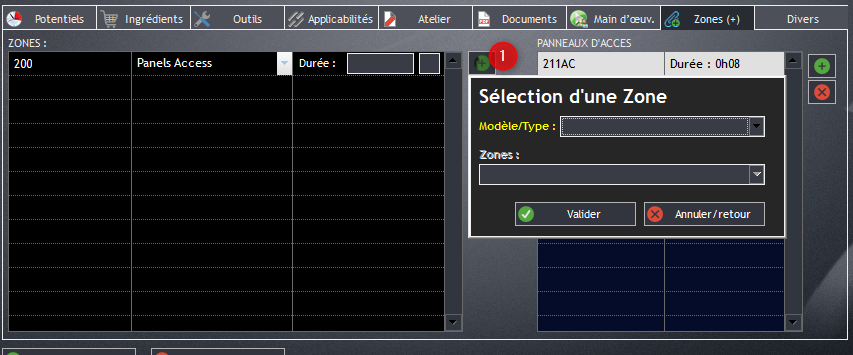 Rubrique “Zones” de la carte de travail