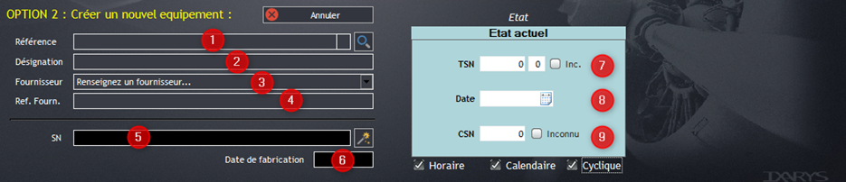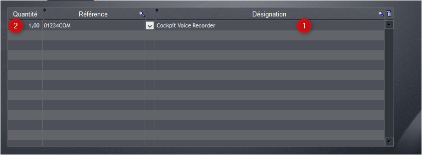En bas de page, renseignez les champs nécessaires à la création de l’article, comme sa référence PN (1), son code ATA (2), sa désignation (3), sa marque, etc. Il est aussi possible d’indiquer une date de péremption si nécessaire.