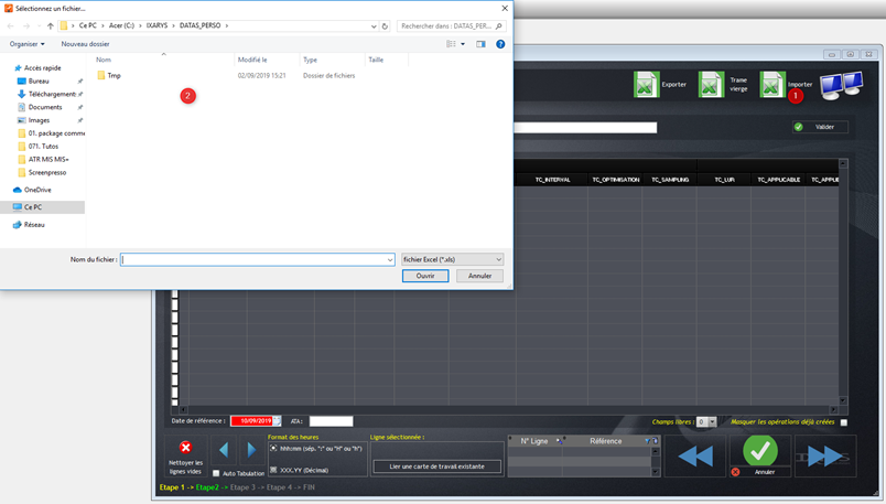 L’action « Importer » un programme (1) ouvre une boîte de dialogue (2) donnant accès au dossier où se trouve le document recherché.