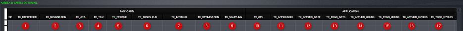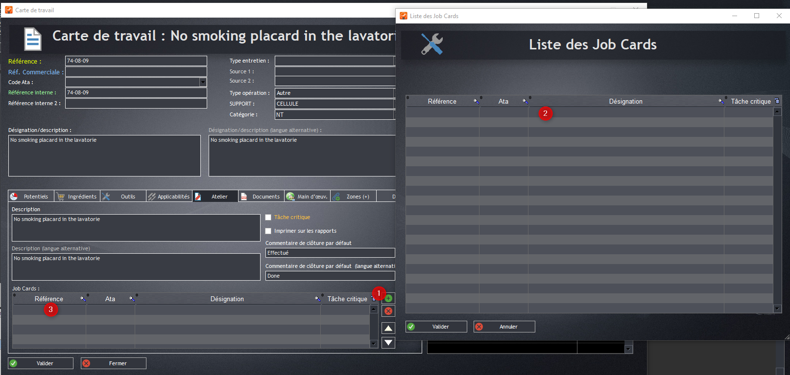 Cadre rouge : informations générales de la carte de travail : Référence, ATA, Type d’entretien, ...
