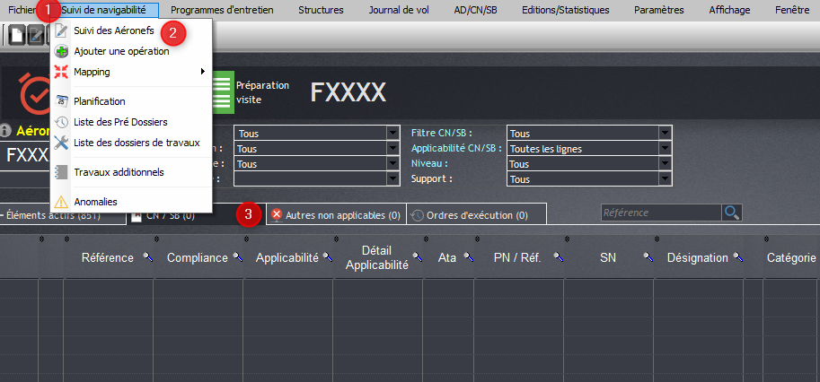 Pour créer un enrôlement cliquez sur “Nouveau” (1), ou pour reprendre un enrôlement en cours cliquez sur “Aéronef existant” (2) puis sélectionnez l'immatriculation de l’avion ou cliquez directement sur une immatriculation existante (3). Les boutons 2 et 3 permettent d’apporter des modifications à un enrôlement déjà existant.