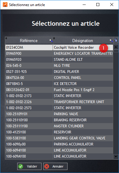 Sélectionnez l’article à modifier et en bas de page il sera possible de changer l’ATA de la pièce (1). Pour que la modification soit prise en compte fermez la page en sauvegardant. Si la modification n’apparaît pas référez-vous à l’annexe 3.