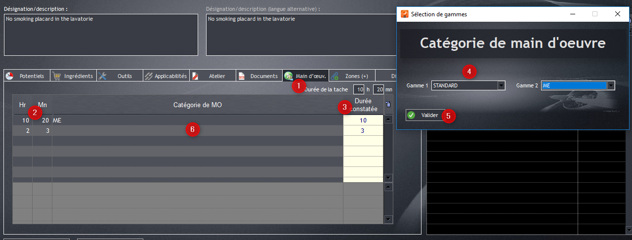 Il est aussi possible d’ajouter du temps de travail ainsi qu’un type de travail. Pour cela allez sur “Main d’œuvre” (1). Ajoutez le temps estimé de la tâche en (2) puis le temps réel constaté (3). Après avoir validé, choisir une gamme (4), gamme 1 “Standard” ou gamme 2 “Hors standard”. Une fois les informations renseignées, allez sur “Valider” (5). La gamme s'affiche en (6).